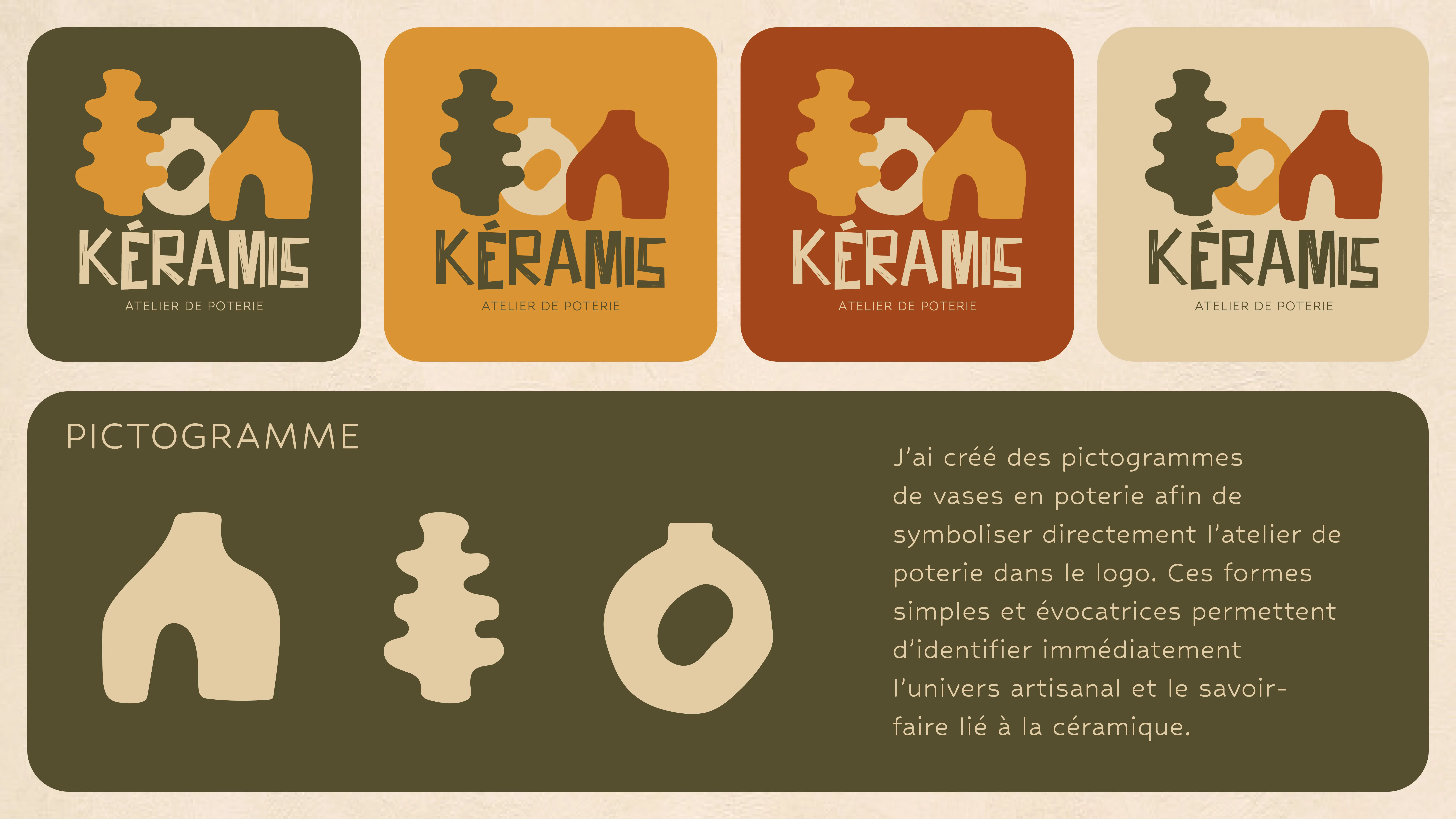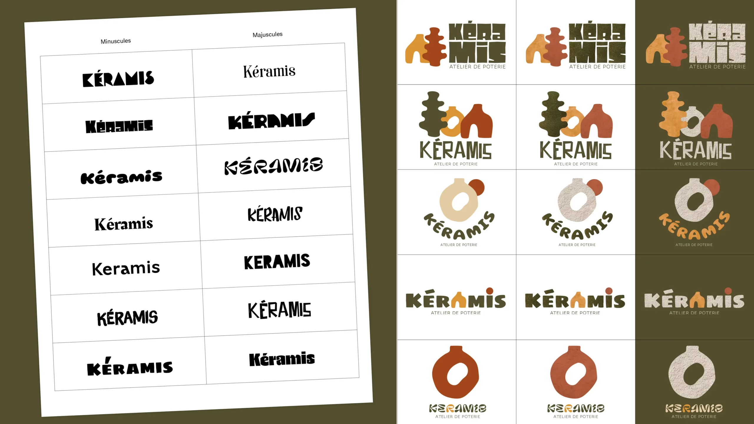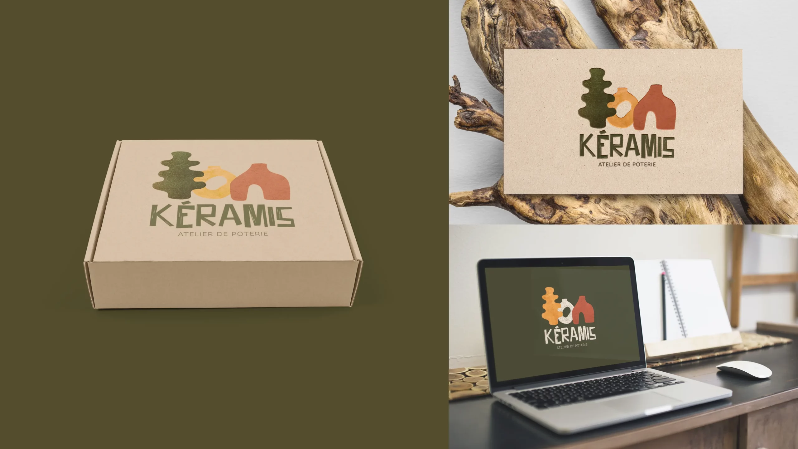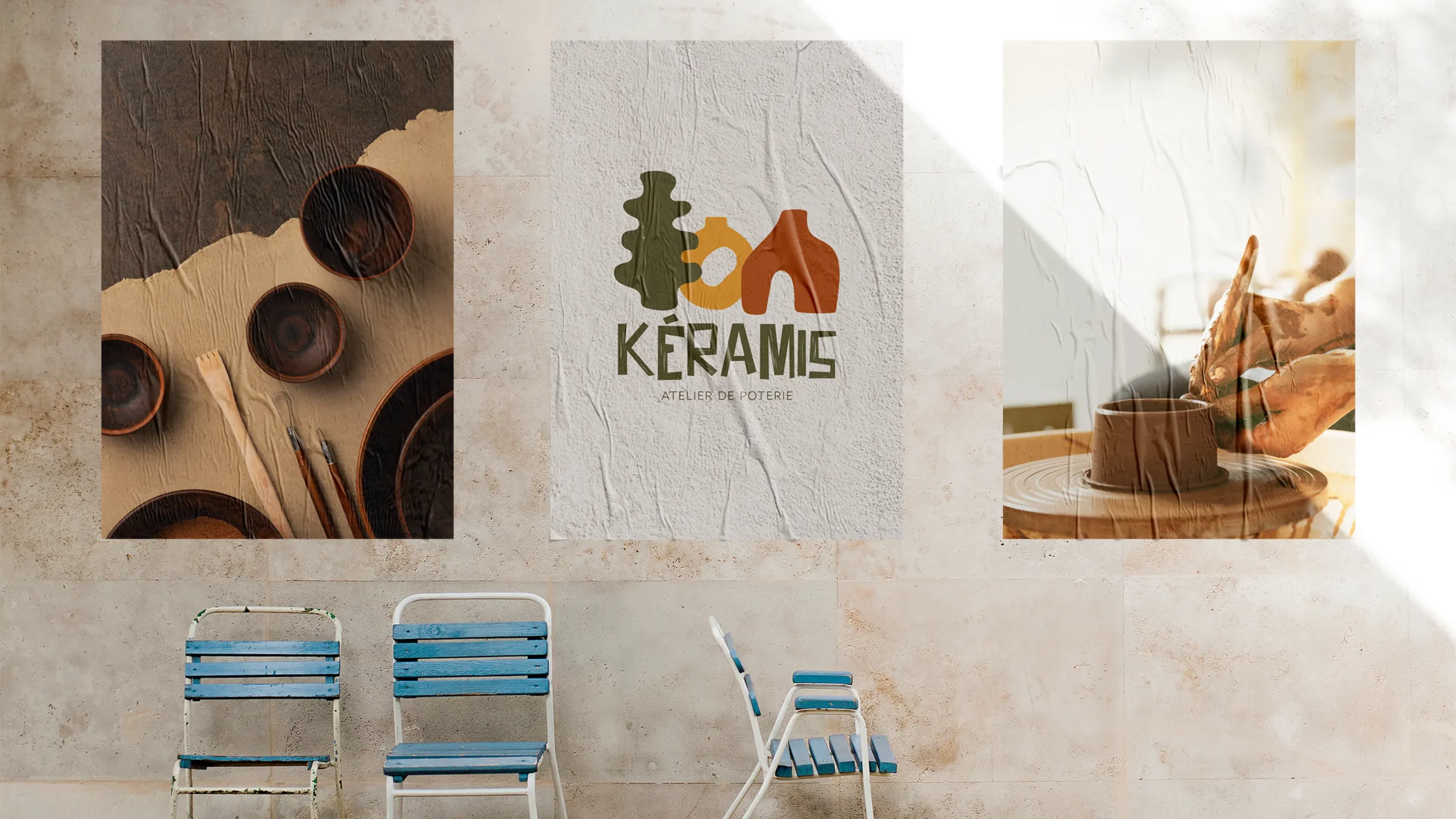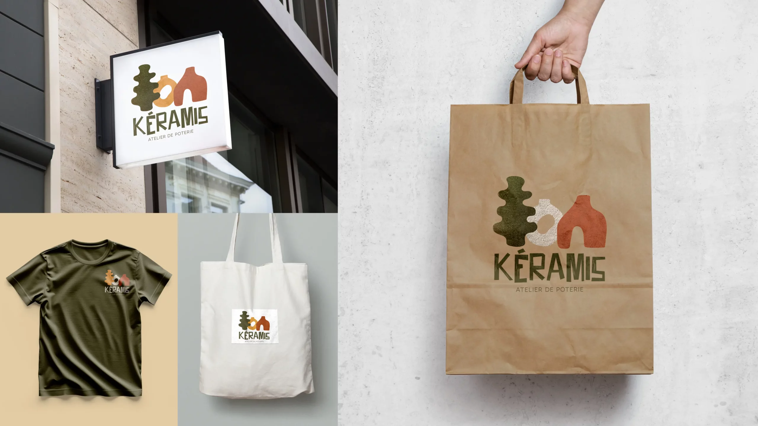 Avec Kéramis, j’ai imaginé l’identité d’un atelier de poterie fictif, un projet personnel pour me challenger en création de logo. Inspirée par les formes de vases modernes et les textures d’argile, j’ai conçu un logo qui symbolise différentes formes de vases, enrichi de textures d’argiles. La palette de couleurs : terracotta, beige et vert émaillé évoque la matière brute et les glaçures céramiques. J’ai décliné cette identité sur divers supports : t-shirts, tote bags, cartes de visite, affiches et packaging, pour créer un univers cohérent.